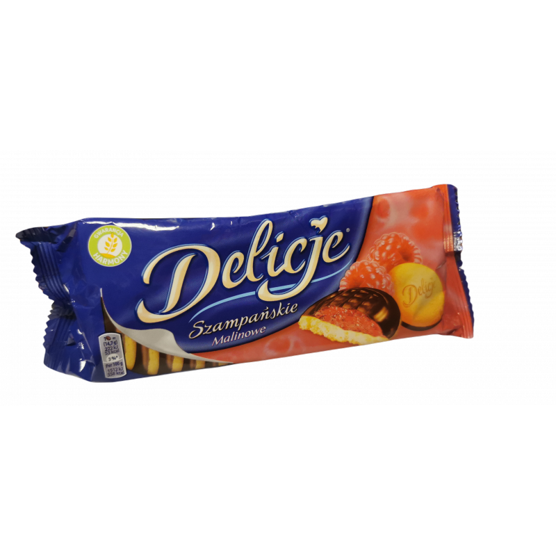 Składniki: syrop glukozowo-fruktozowy, cukier, czekolada 15% [cukier, miazga kakaowa, tłuszcz kakaowy, tłuszcze roślinne (palmowy, shea) w zmiennych proporcjach, emulgatory (lecytyna sojowa, E 476), aromat], mąka pszenna, jaja, woda, skrobia ziemniaczana, substancja utrzymująca wilgoć (glicerol), olej rzepakowy, regulatory kwasowości (kwas cytrynowy, kwas jabłkowy, cytryniany sodu), substancja żelująca (pektyny), zagęszczony sok malinowy 0,3%, aromaty, barwniki (koszenila, karoteny), sól, substancja spulchniająca (węglany amonu), emulgator (E 471). Oprócz tłuszczu kakaowego zawiera tłuszcze roślinne.