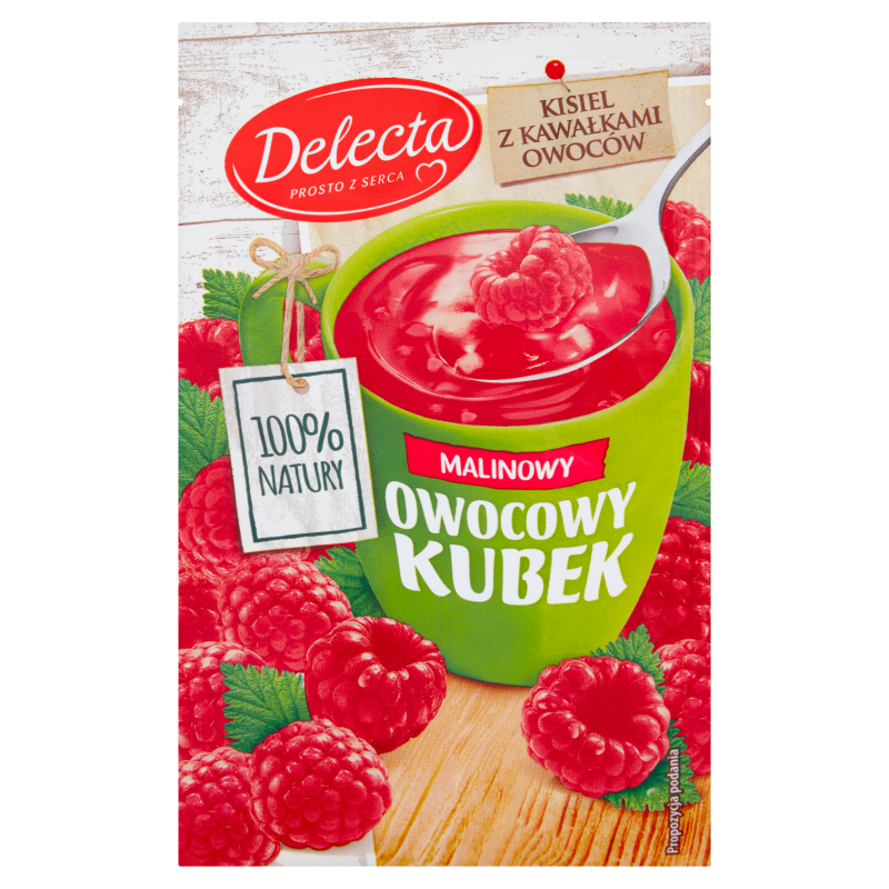 Opis produktu: Owocowy Kubek to 100% naturalny i lekki deser, gotowy zaledwie w kilka chwil. Delektuj się pysznym, mocno owocowym smakiem, wzbogaconym kawałkami owoców.