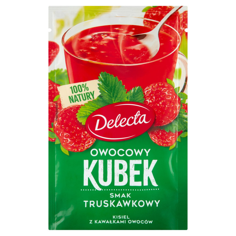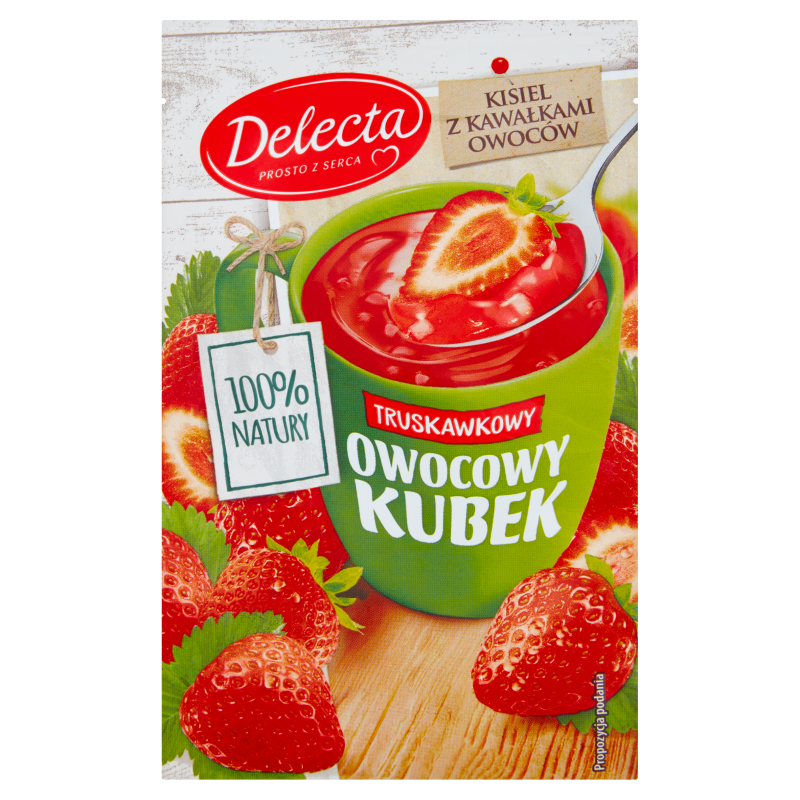 Opis produktu: Owocowy Kubek to 100% naturalny i lekki deser, gotowy zaledwie w kilka chwil. Delektuj się pysznym, mocno owocowym smakiem, wzbogaconym kawałkami owoców.