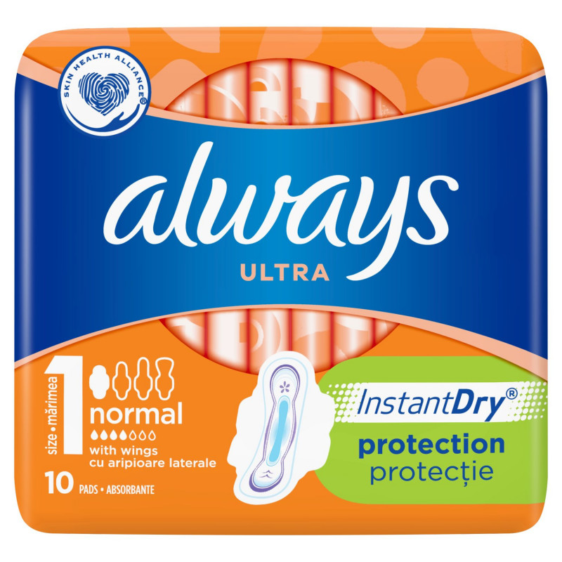 Opis produktu: Podpaski Always Ultra Normal (rozmiar 1) z systemem InstantDry wchłaniają wilgoć w kilka sekund. Zamykają płyn w swoim wnętrzu, zapewniając do 100% ochrony.