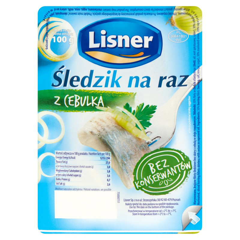 Nazwa produktu uregulowana prawnie: Marynowane, krojone filety śledziowe bez skóry z cebulką w oleju rzepakowym.